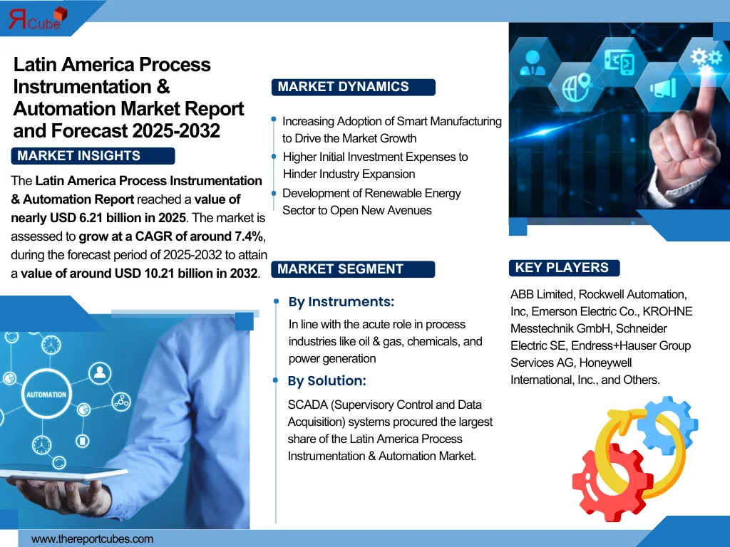 According to The Report Cube study the Latin America Process Instrumentation & Automation Market  Report reached a value of nearly USD 6.21 billion in 2025. The market is assessed to grow at a CAGR of around 7.4%, during the forecast period of 2025-2032 to attain a value of around USD 10.21 billion in 2032. Factors like amplified energy efficiency concerns, swift industrialization, and escalating regulatory compliance in industries, including pharmaceuticals, chemicals, food & beverage (F&B), and oil & gas, are all subsidizing the regional market expansion in demand for cultured instrumentation & automation systems.