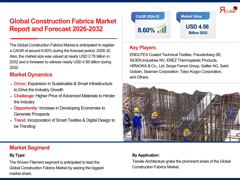 According to The Report Cube study the Global Construction Fabrics Market is anticipated to register a CAGR of around 8.60% during the forecast period, 2026-32. Also, the market size was valued at nearly USD 2.78 billion in 2025 and is foreseen to witness nearly USD 4.56 billion during 2032. Construction fabrics, commonly known as construction textiles or architectural membranes, are specifically engineered materials utilized across several infrastructure & architectural projects for their great performance, stability, lightweight nature, and aesthetic tractability.