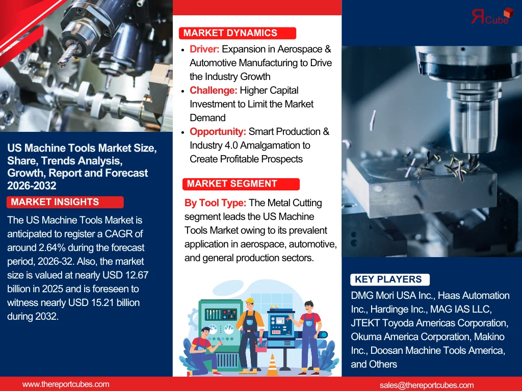 According to The Report Cube study the US Machine Tools Market is anticipated to register a CAGR of around 2.64% during the forecast period, 2026-32. Also, the market size is valued at nearly USD 12.67 billion in 2025 and is foreseen to witness nearly USD 15.21 billion during 2032. The production industries of electronics, automotive, aerospace, and military depend largely on machine tools, which include metal cutting, forming, and auxiliary tools. Also, elevated automation, accuracy, and production efficacy all depend on these tools.