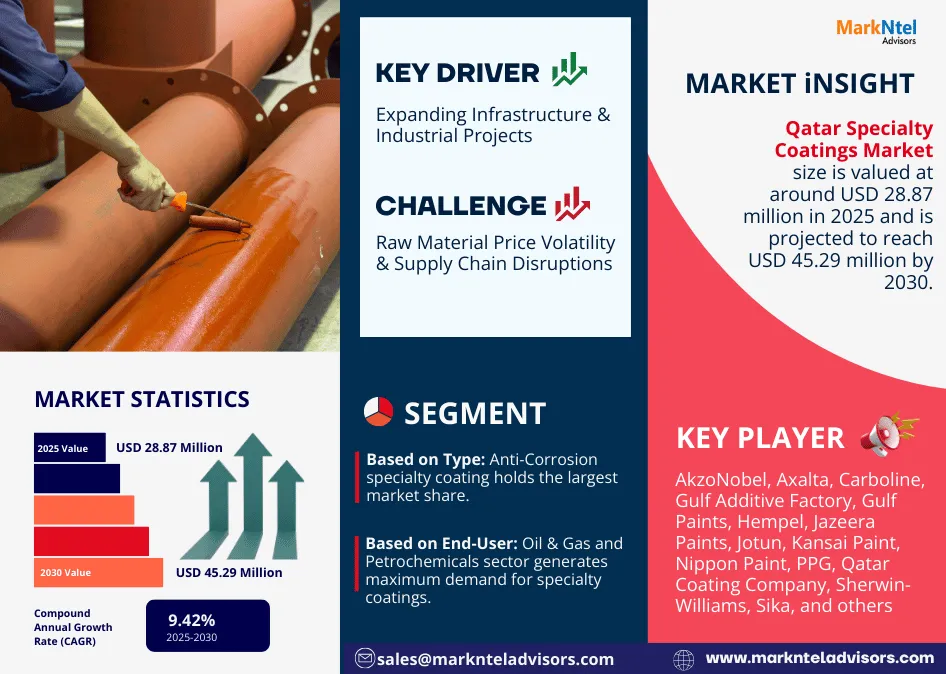 According to MarkNtel Advisors study The future of Qatar Specialty Coatings Market size is valued at around USD 28.87 million in 2025 and is projected to reach USD 45.29 million by 2030. Along with this, the market is estimated to grow at a CAGR of around 9.42% during the forecast period, i.e., 2025-30.
