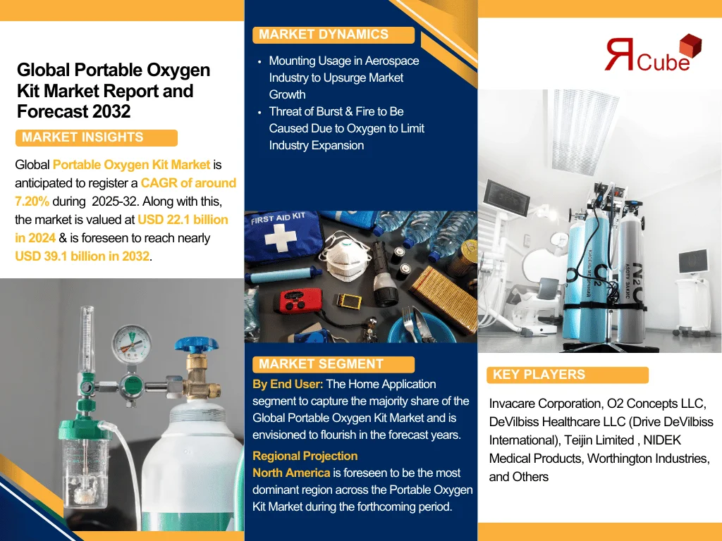 According to The Report Cube study the Global Portable Oxygen Kit Market is anticipated to register a CAGR of around 7.20% during the forecast period, i.e., 2025-32. Along with this, the market is valued at USD 22.1 billion in 2024 & is foreseen to reach nearly USD 39.1 billion in 2032. Portable oxygen cylinders are medical devices or instruments that provide extra oxygen to peoples suffering from respiratory issues or low blood oxygen levels. Portable oxygen kits let elderly people with respiratory problems to effortlessly receive medical oxygen at home or at any place. Thus, their frequent visits to hospitals & clinics for oxygen intake are minimalized. The portable oxygen kit has sufficient medical oxygen to last a few days for chronic respiratory illness sufferers. Further, after oxygen is stored in a portable oxygen cylinder, it is transported to the patient or the required people using an oxygen mask, nasal tubes, or an oxygen rebreather.