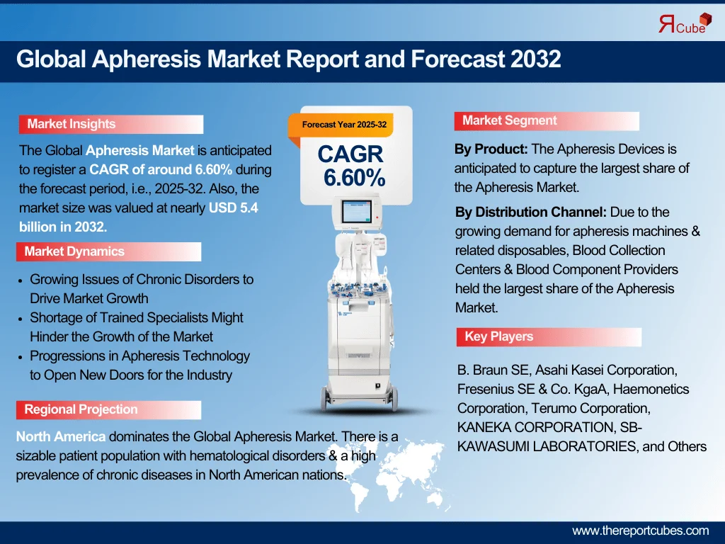 According to The Report Cube study the Global Apheresis Market is anticipated to register a CAGR of around 6.60% during the forecast period, i.e., 2025-32. Also, the market size was valued at nearly USD 5.4 billion in 2032. The market size is been driven by the upgrade in the prevalence of chronic illnesses & technological developments in the healthcare industry. As apheresis aids in blood filtration & purification, it is utilized in several medical procedures, such as rheumatoid arthritis, cancer treatment, kidney disorders, and diabetes. Additionally, the industry is expanding due to the surge in the frequency of cardiovascular disorders among the elderly population. To achieve optimal outcomes, Apheresis market trends companies are expanding their product portfolios by introducing new products with cutting-edge technologies. Further, in order to match consumer expectations & expand their brands globally, they are entering into business relationships. Businesses in this sector concentrate on R&D to create innovative medical supplies for Apheresis devices and disposables.
