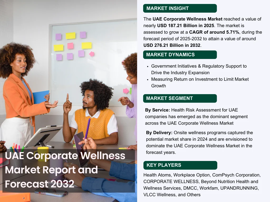 According to The Report Cube study the UAE Corporate Wellness Market reached a value of nearly USD 187.21 Billion in 2025. The market is assessed to grow at a CAGR of around 5.71%, during the forecast period of 2025-2032 to attain a value of around USD 276.21 Billion in 2032. Workplace wellness initiatives in Dubai, Abu Dhabi, and other emirates are undergoing tremendous progression, fueled by elevated consciousness of employee health & its direct correlation with efficiency & retention. The government's National Strategy for Wellbeing 2031 has considerably swayed corporate attitudes, with enterprises progressively observing employee well-being solutions as vital investments rather than discretionary benefits.
