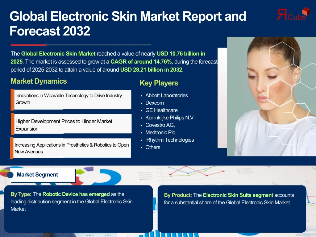 According to The Report Cube study the Global Electronic Skin Market reached a value of nearly USD 10.76 billion in 2025. The market is assessed to grow at a CAGR of around 14.76%, during the forecast period of 2025-2032 to attain a value of around USD 28.21 billion in 2032. The industry is observing rapid expansion, compelled by developments in wearable technology & the mounting adoption of smart healthcare solutions. E-skin technology, which mimics human skin's sensory capabilities, is gaining traction in healthcare, robotics, and prosthetics.