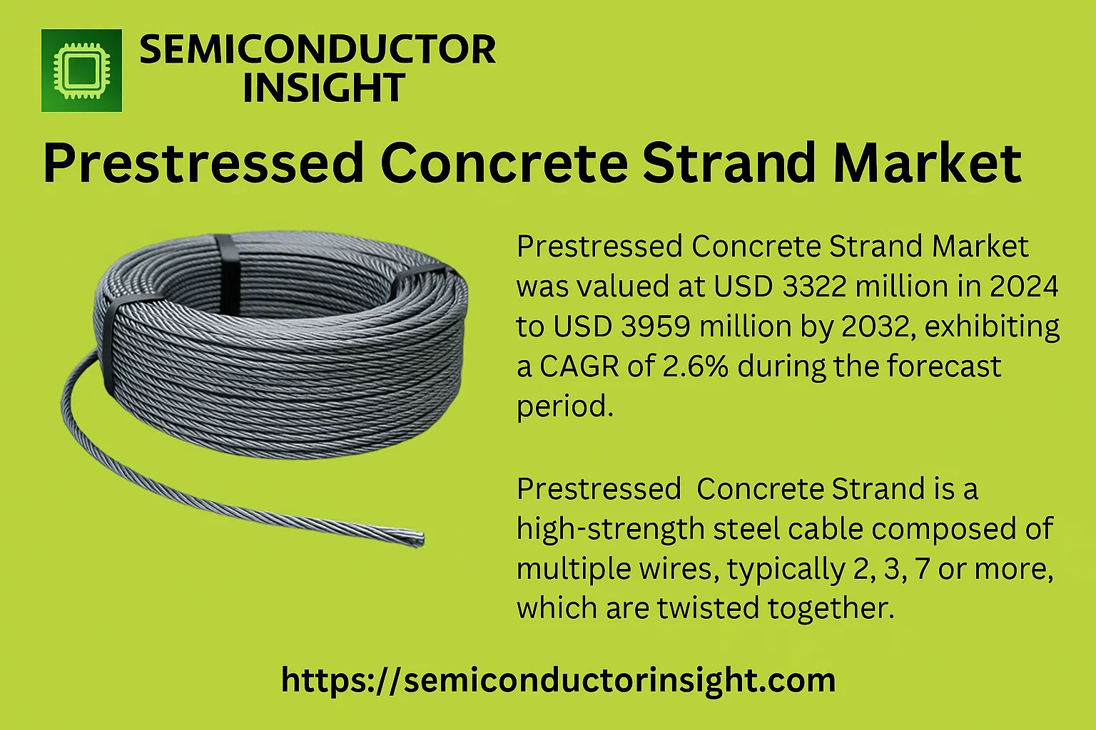 Prestressed Concrete Strand Market, valued at USD 3322 million in 2024, is set for steady growth, projected to reach USD 3959 million by 2032. This progression, reflecting a compound annual growth rate (CAGR) of 2.6%, is detailed in a comprehensive new report published by Semiconductor Insight. This essential reinforcement material, comprising high-tensile steel wires twisted together, is fundamental to modern construction practices, providing the structural integrity required for long-span and heavy-load-bearing applications.