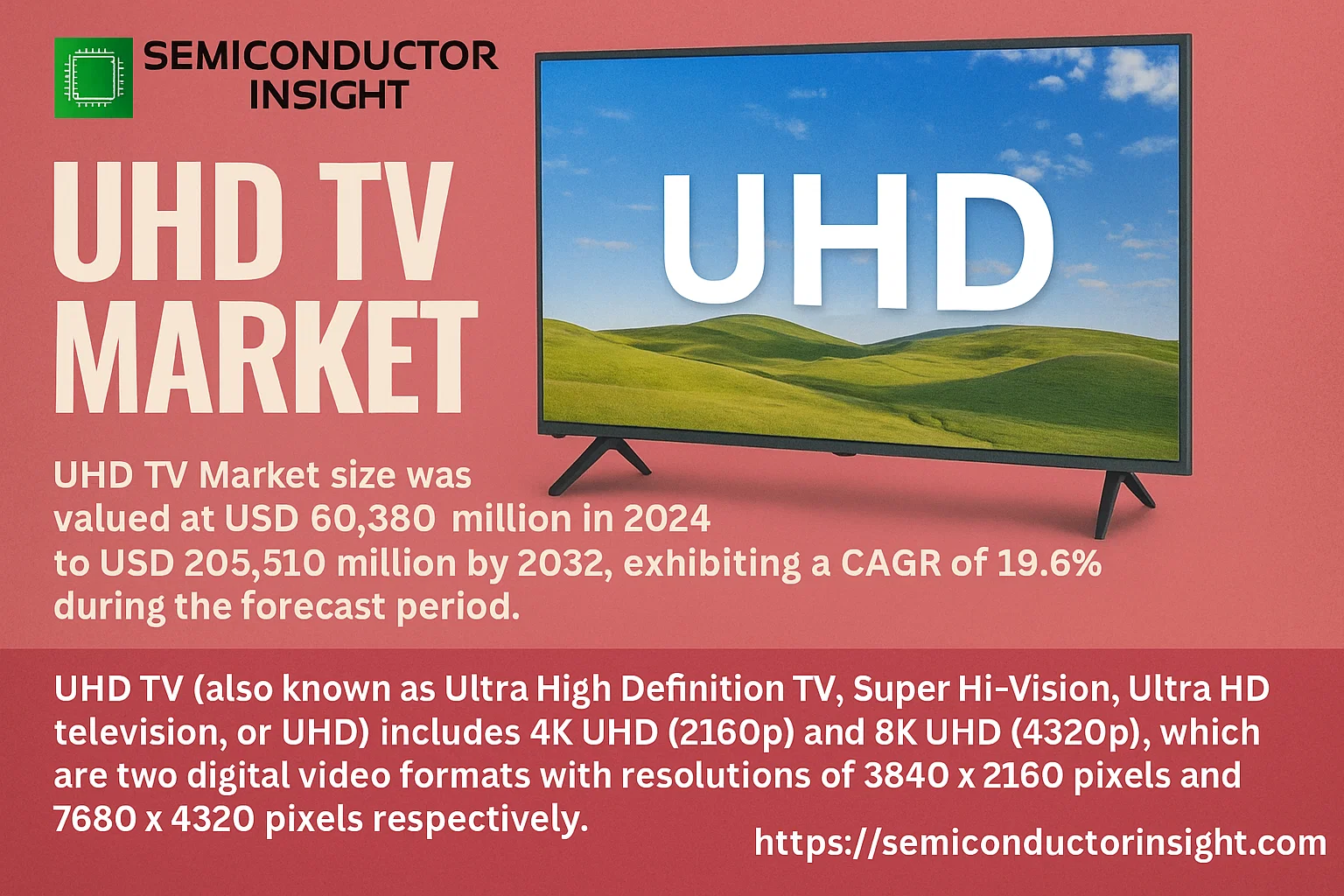 UHD TV Market, valued at a robust USD 60,380 million in 2024, is on a trajectory of significant expansion, projected to reach USD 205,510 million by 2032. This growth, representing a compound annual growth rate (CAGR) of 19.6%, is detailed in a comprehensive new report published by Semiconductor Insight. The study highlights the critical role of these advanced home entertainment devices in defining modern visual experiences across both consumer households and commercial enterprises.