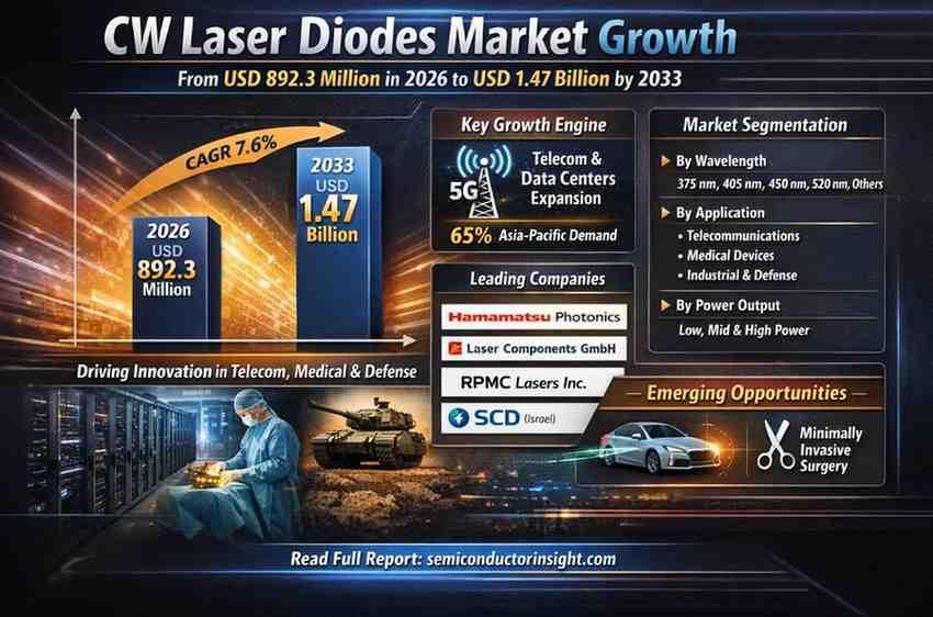 CW Laser Diodes Market, valued at USD 892.3 million in 2026, is poised for substantial expansion, projected to reach USD 1.47 billion by 2033. This growth trajectory, representing a compound annual growth rate (CAGR) of 7.6%, is detailed in a comprehensive new report published by Semiconductor Insight. The study underscores the critical role of continuous-wave laser diodes in enabling precision across various high-technology applications, from telecommunications to medical devices and defense systems.