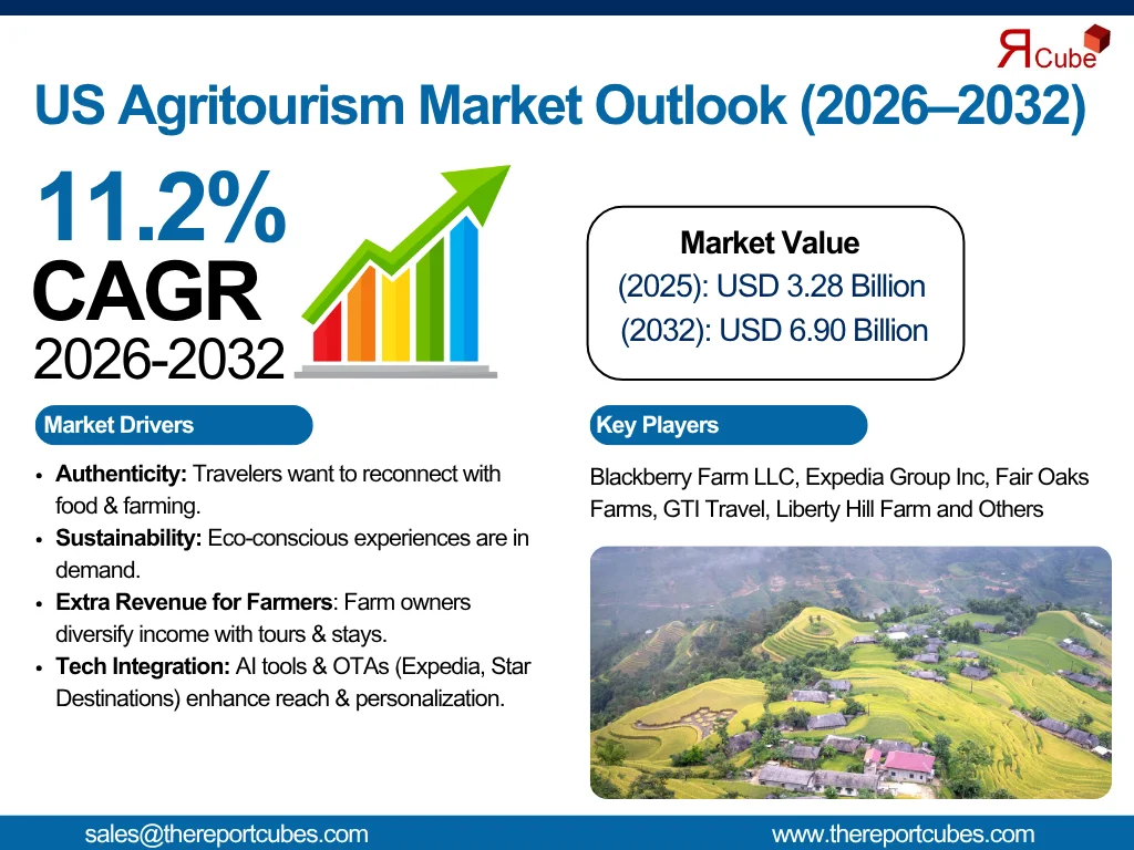The US Agritourism Market is anticipated to register a CAGR of around 3.28% during the forecast period, 2026-32. Additionally, the market size was valued at nearly USD 3.28 billion in 2025 and is projected to reach nearly USD 6.90 billion by 2032.