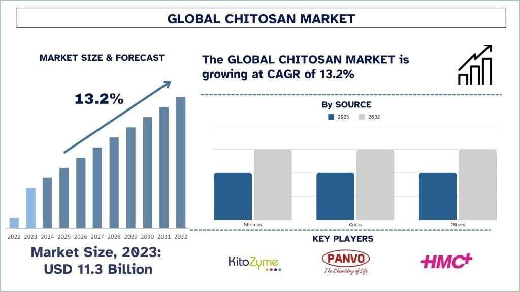According to the UnivDatos analysis, comprehensive government support through environmental regulations, R&D grants, agricultural subsidies, waste management policies, and pharmaceutical regulations promoting sustainable and biodegradable materials will drive the global scenario of the Chitosan market. As per their “Chitosan Market” report, the global market was valued at USD 11.3 Billion in 2023, growing at a CAGR of 13.2% during the forecast period from 2024 - 2032 to reach USD Billion by 2032.