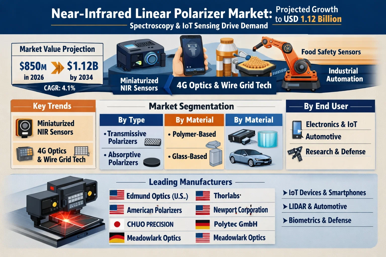This comprehensive analysis covers the global NIR Linear Polarizer market from 2024–2032. It features insights into the integration of AI-enhanced chemometrics for spectral data analysis, the impact of recent 2025/2026 trade tariffs on optical material sourcing, and the shift toward sustainable, bio-based polymer substrates.