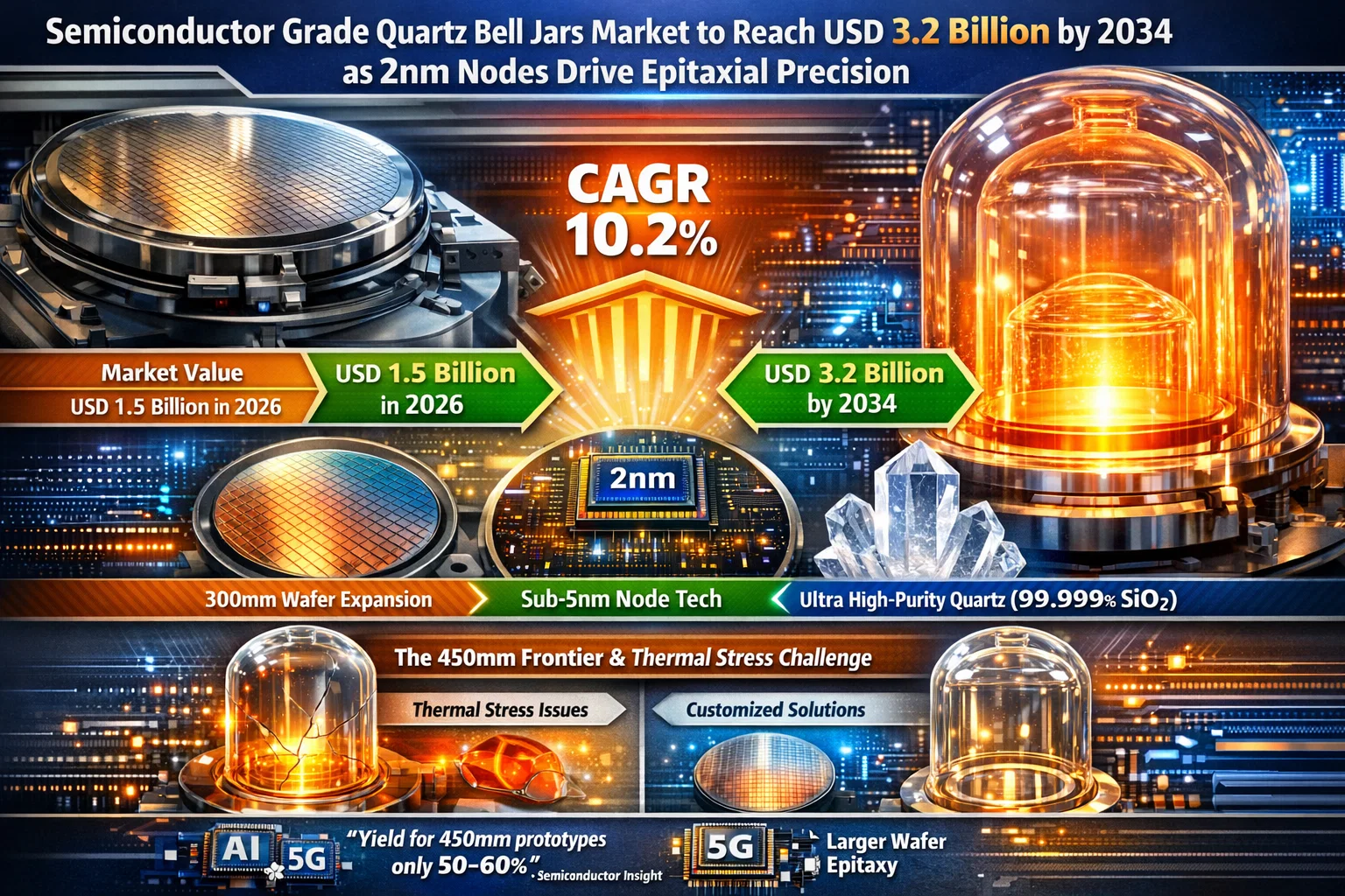 "In 2026, the manufacturing of large-diameter bell jars remains the industry’s greatest technical bottleneck," according to Semiconductor Insight. "As diameters push beyond 400mm, maintaining structural integrity during the rapid thermal cycling of epitaxial processes becomes exponentially harder. Thermal stress cracking during the cooling phase is the primary failure mode, with current yields for 450mm prototypes sitting at just 50–60%. This has led to a market premium for 'Customized' bell jars that feature advanced stress-relief geometries."