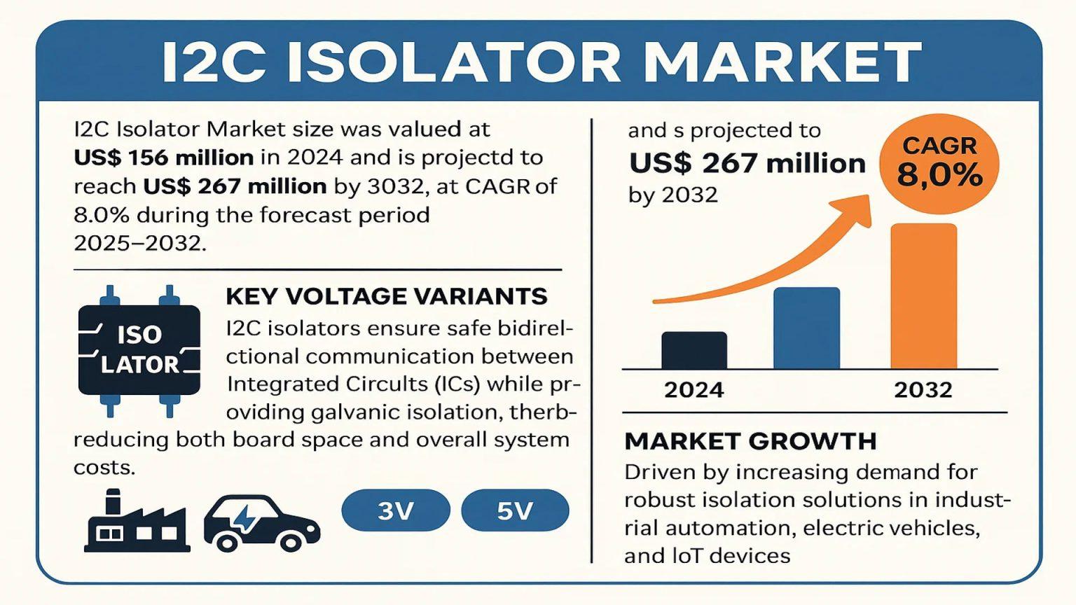 Global I2C Isolator Market, valued at USD 156 million in 2026, is projected to reach USD 267 million by 2034, growing at a CAGR of 8.0%. As of early 2026, the market has entered a critical phase of expansion driven by the 800V EV transition and the rise of Industry 4.0 smart factories. These components, once specialized niche parts, are now standard in safety-critical systems where protecting low-voltage microcontrollers from high-voltage transients is paramount.