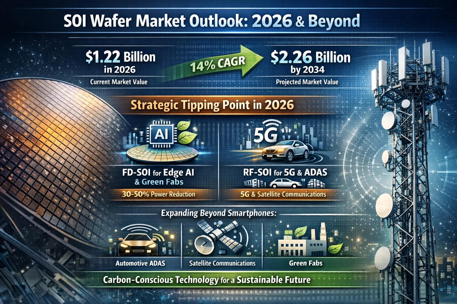 Global SOI (Silicon on Insulator) Wafer Market, valued at USD 1.22 billion in 2026, is accelerating through 2034 with a projected market value of USD 2.26 billion. This growth, characterized by a CAGR of approximately 14% (as of current 2026 estimates), is being driven by the widespread adoption of FD-SOI (Fully Depleted SOI) for energy-efficient Edge AI and the massive scale-up of RF-SOI for 5G-Advanced infrastructure.
