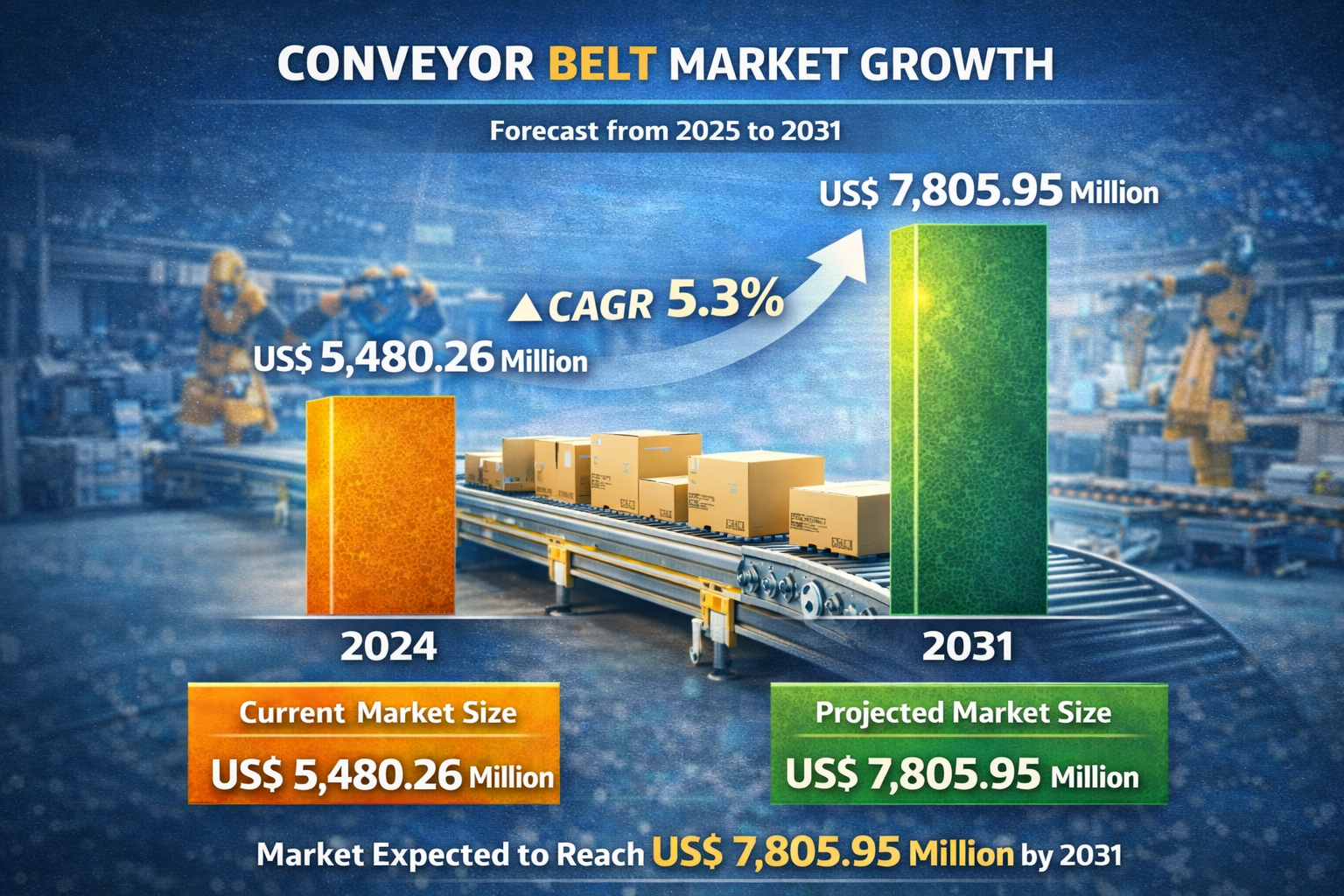 The global conveyor belt market is projected to grow from US$ 5,480.26 million in 2024 to US$ 7,805.95 million by 2031, registering a CAGR of 5.3% during 2025–2031. This steady expansion is driven primarily by rapid industrial automation, warehouse modernization, and infrastructure development across emerging and developed economies.