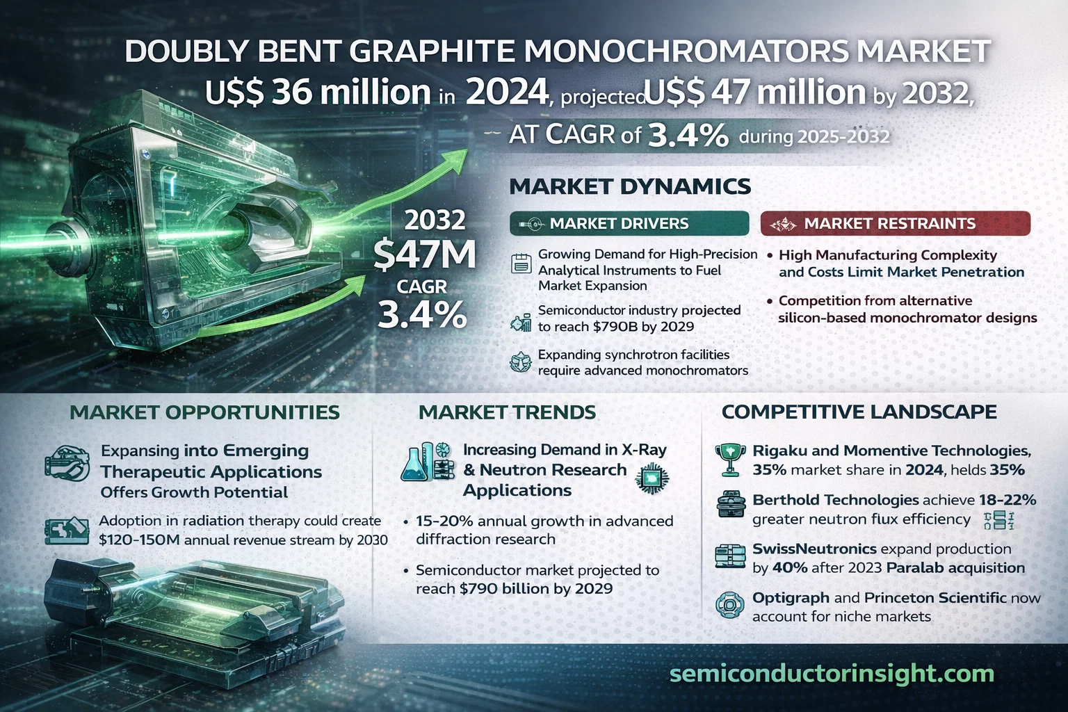 Global Doubly Bent Graphite Monochromators market is steadily gaining traction as advanced research facilities and semiconductor manufacturers demand higher wavelength precision and beam-focusing efficiency. Valued at USD 36 million in 2026, the market is projected to reach US$ 47 million by 2034, expanding at a CAGR of 3.4% during the forecast period 2026–2034.