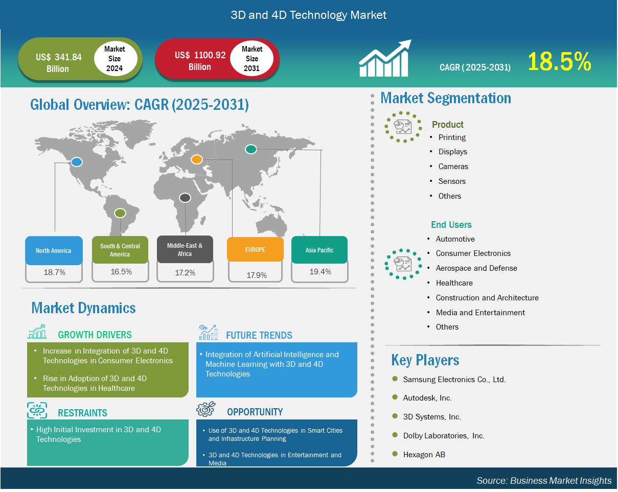 According to the Business Market Insights The Global 3D and 4D Technology Market is experiencing explosive growth, valued at US$ 341.84 billion in 2024 and projected to surge to US$ 1,100.92 billion by 2031, achieving a robust compound annual growth rate (CAGR) of 18.5% from 2025 to 2031.