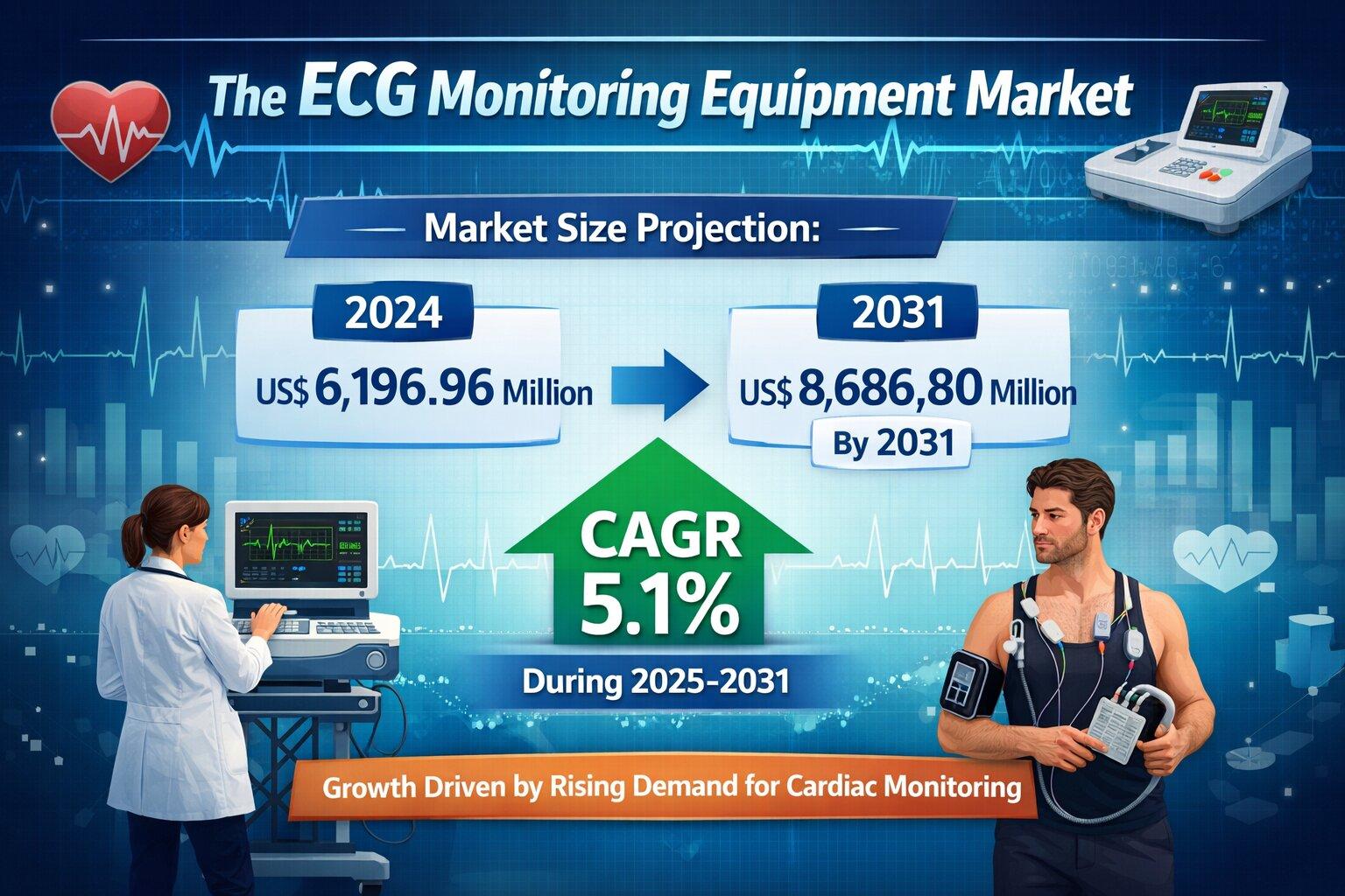 The ECG Monitoring Equipment Market is projected to grow steadily from US$ 6,196.96 million in 2024 to US$ 8,686.80 million by 2031, registering a CAGR of 5.1% during 2025–2031. The market expansion is strongly linked to the increasing global burden of cardiovascular diseases, rising healthcare investments, and continuous technological innovations in cardiac monitoring systems.