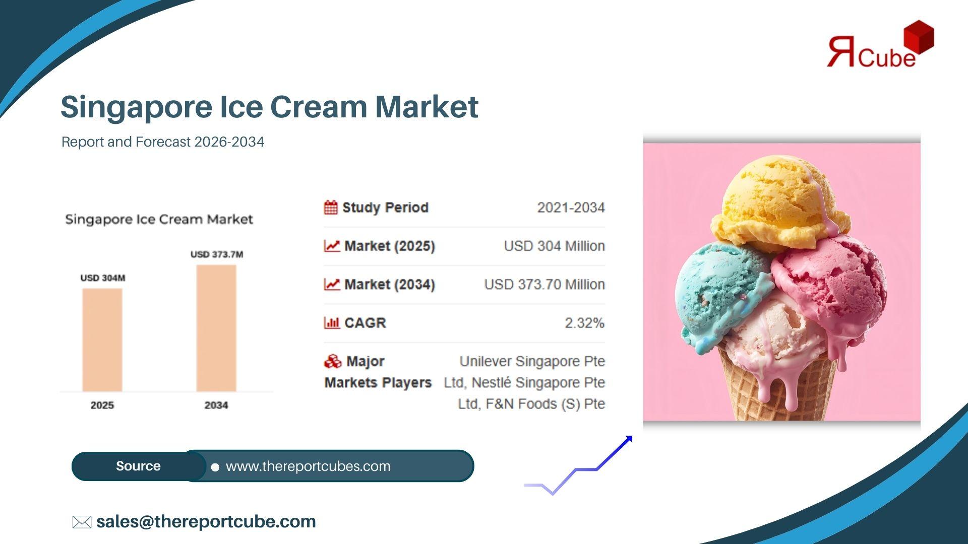The Singapore Ice Cream Market is projected to reach USD 373.70 Million by 2034, expanding at a compound annual growth rate (CAGR) of 2.32% during the forecast period 2026-2034. According to the latest industry analysis published by The Report Cube, the market was valued at USD 304 Million in 2025.