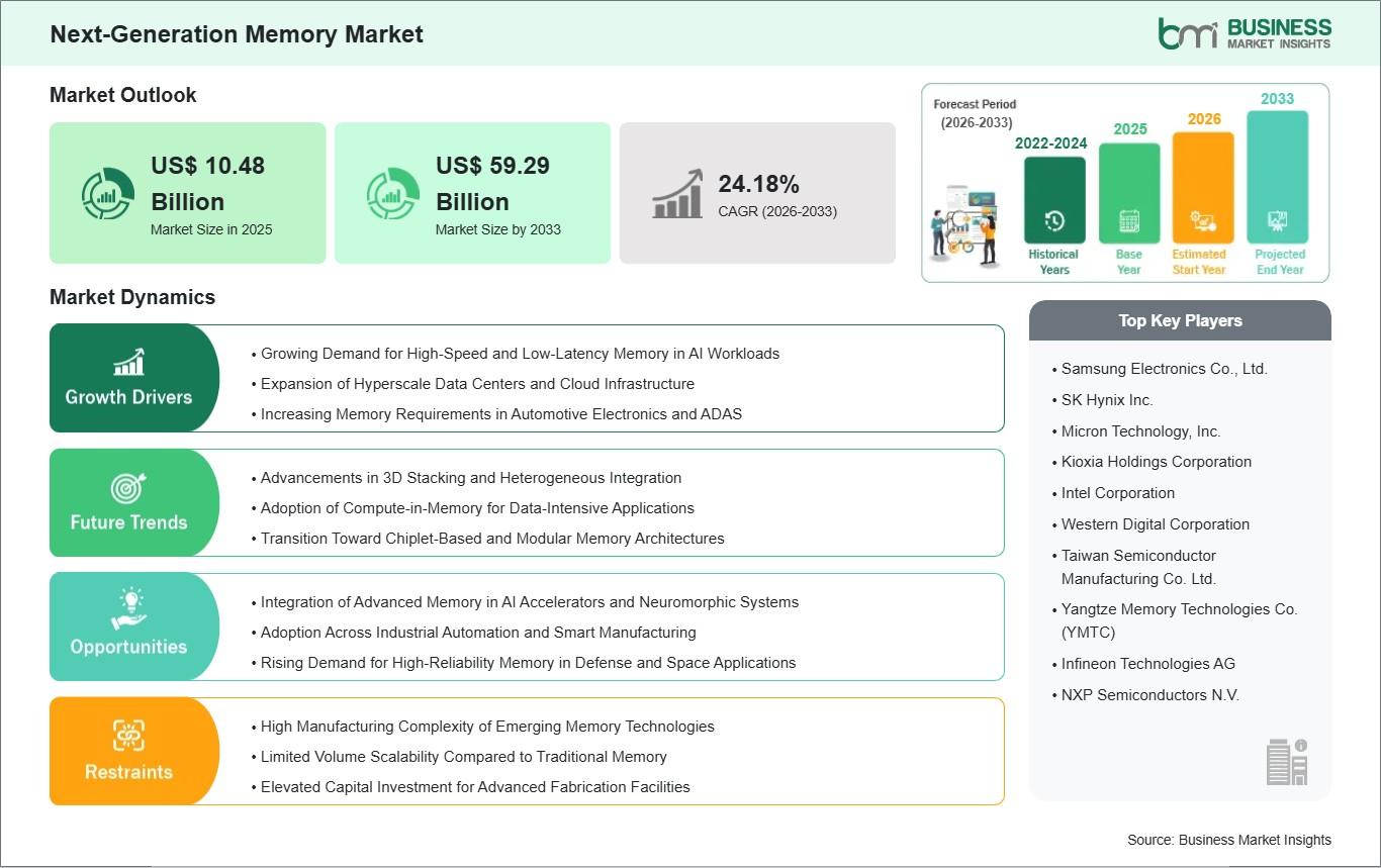 According to the Business Market Insights The Global Next-Generation Memory Market is on a high-growth trajectory, projected to expand from US$10,486.06 million in 2025 to an impressive US$59,296.01 million by 2033. This surge reflects a robust compound annual growth rate (CAGR) of 24.18% from 2026 to 2033, driven by surging demand for advanced data storage solutions in AI, IoT, and cloud computing.