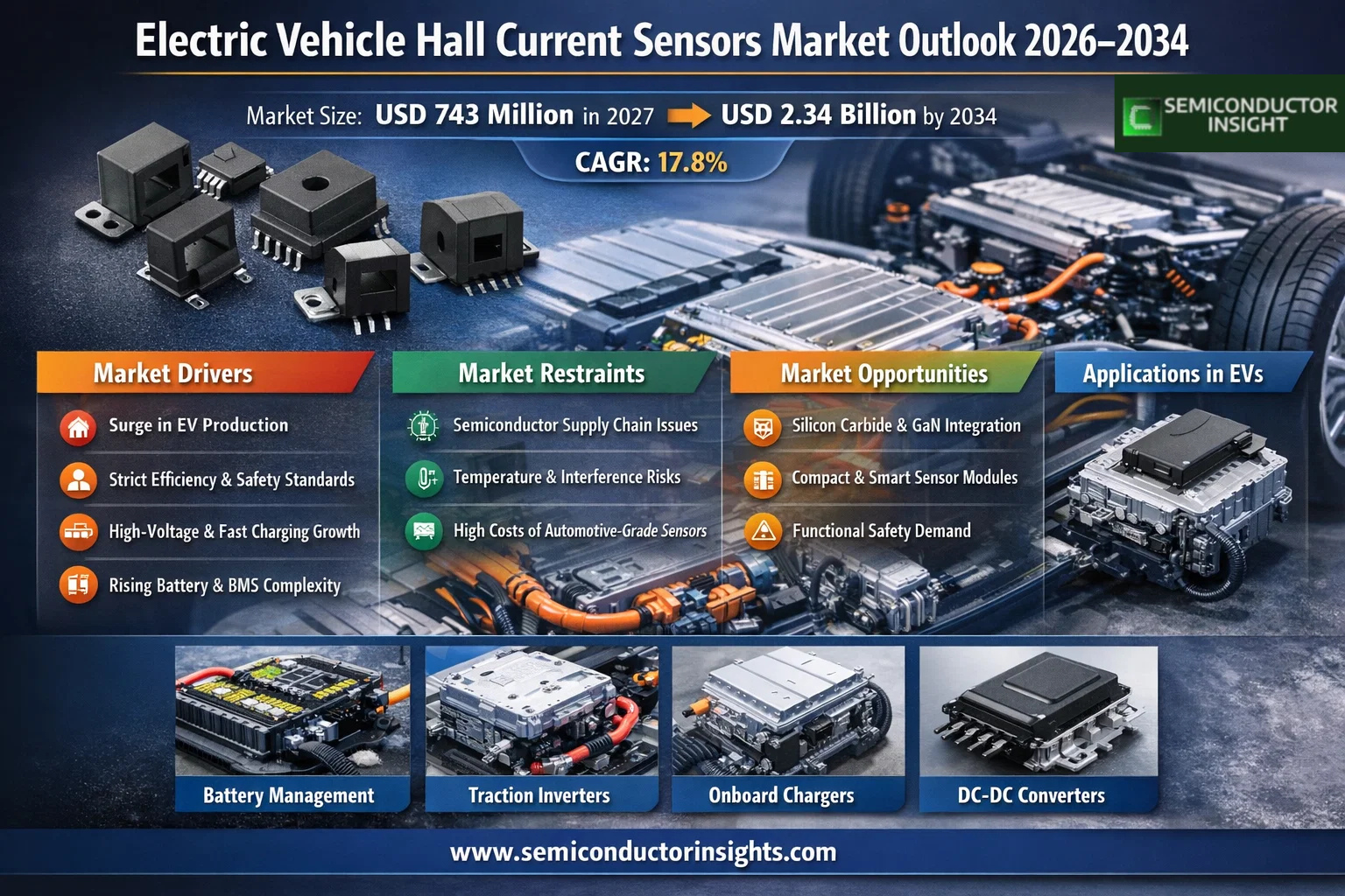 Global Electric Vehicle Hall Current Sensors Market was valued at USD 743 million in 2026 and is projected to reach USD 2.34 billion by 2034, registering a CAGR of 17.8% during the forecast period 2026–2034. Market expansion is being shaped by rising electric vehicle production volumes, higher battery capacities, and stricter efficiency and safety requirements across next-generation vehicle platforms.
