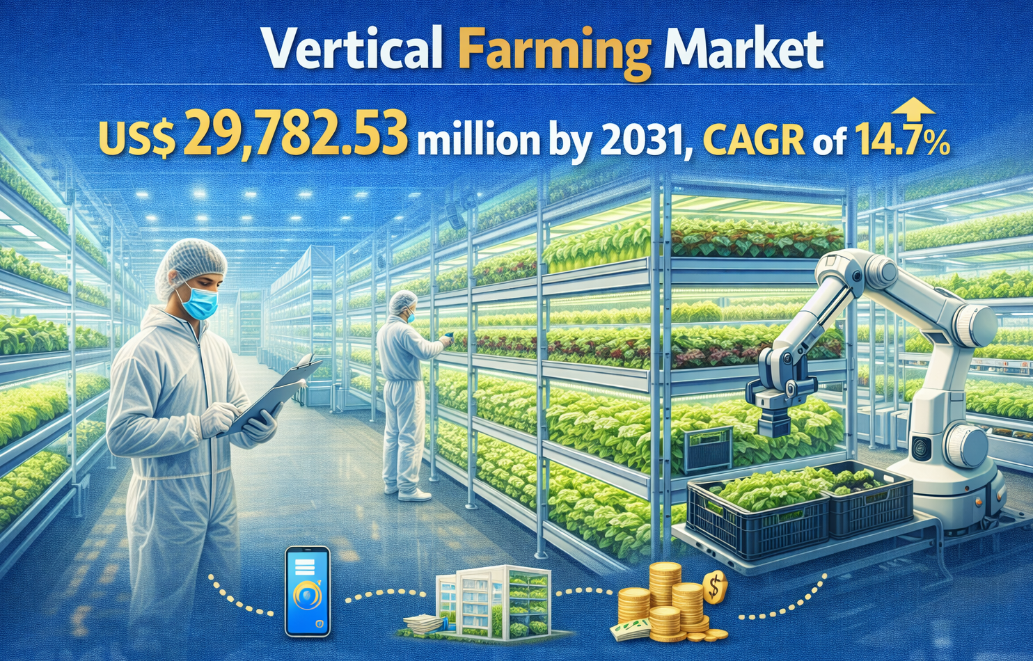According to industry estimates, the Vertical Farming Market is projected to grow from approximately US$ 9.9 billion in 2023 to nearly US$ 29.8 billion by 2031, registering a CAGR of 14.7% during the forecast period. Rising consumer awareness of healthy diets, increasing demand for organic produce, and the growing adoption of precision agriculture technologies are major contributors to this growth.