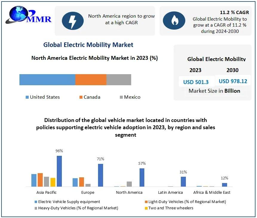 Anticipated Growth in Revenue: The Electric Mobility Market was valued at US $501.3 Billion in 2022. The market is expected to grow at a CAGR of 10.37% valuing at US $978.12 Billion by 2030.