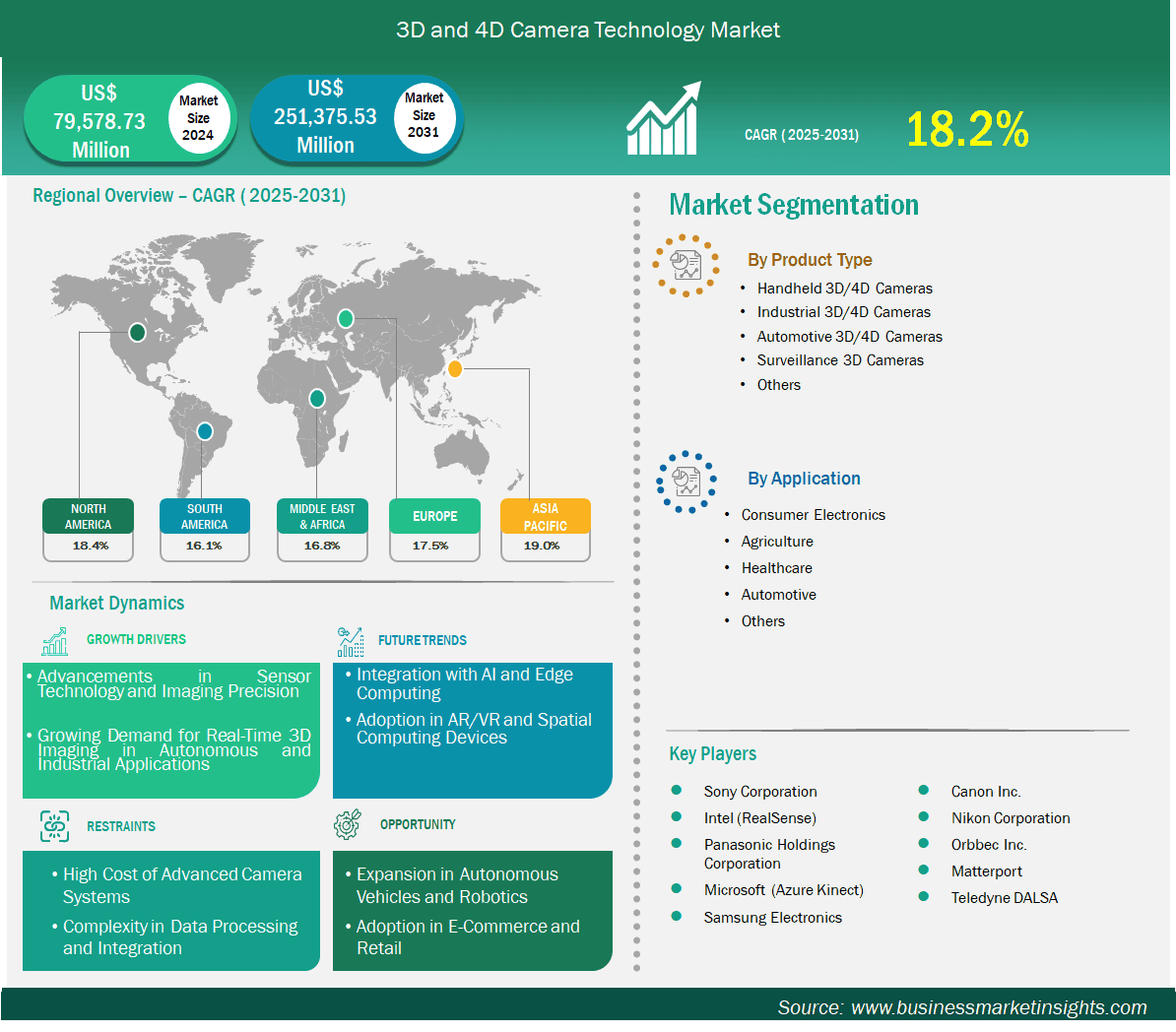 Opportunities abound in emerging apps like holography, home automation, and defense. With the 3D and 4D camera market forecast hitting US$ 251 billion by 2031, stakeholders should invest in R&D for hybrid tech. The 18.2% CAGR positions this as a high-ROI sector for 2025-2031.