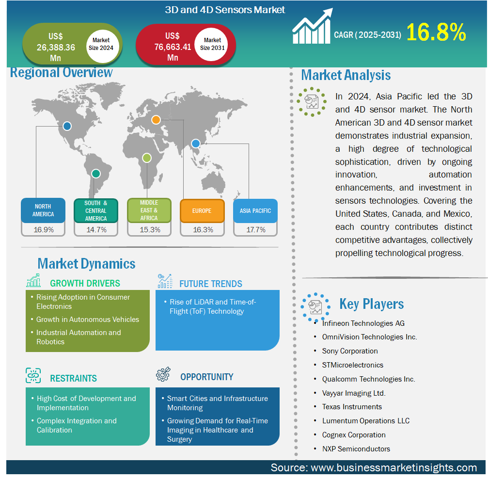 According to the Business Market Insights The 3D and 4D Sensor Market Landscape is witnessing rapid expansion as industries increasingly adopt advanced sensing technologies to enable real-time spatial awareness and intelligent automation. These sensors are designed to capture depth, motion, and environmental data, making them essential components in emerging technologies such as autonomous vehicles, robotics, augmented reality (AR), and smart devices. According to industry analysis, the global 3D and 4D sensor market was valued at US$26,388.36 million in 2024 and is projected to reach US$76,663.41 million by 2031, growing at a CAGR of 16.8% during the forecast period 2025–2031.