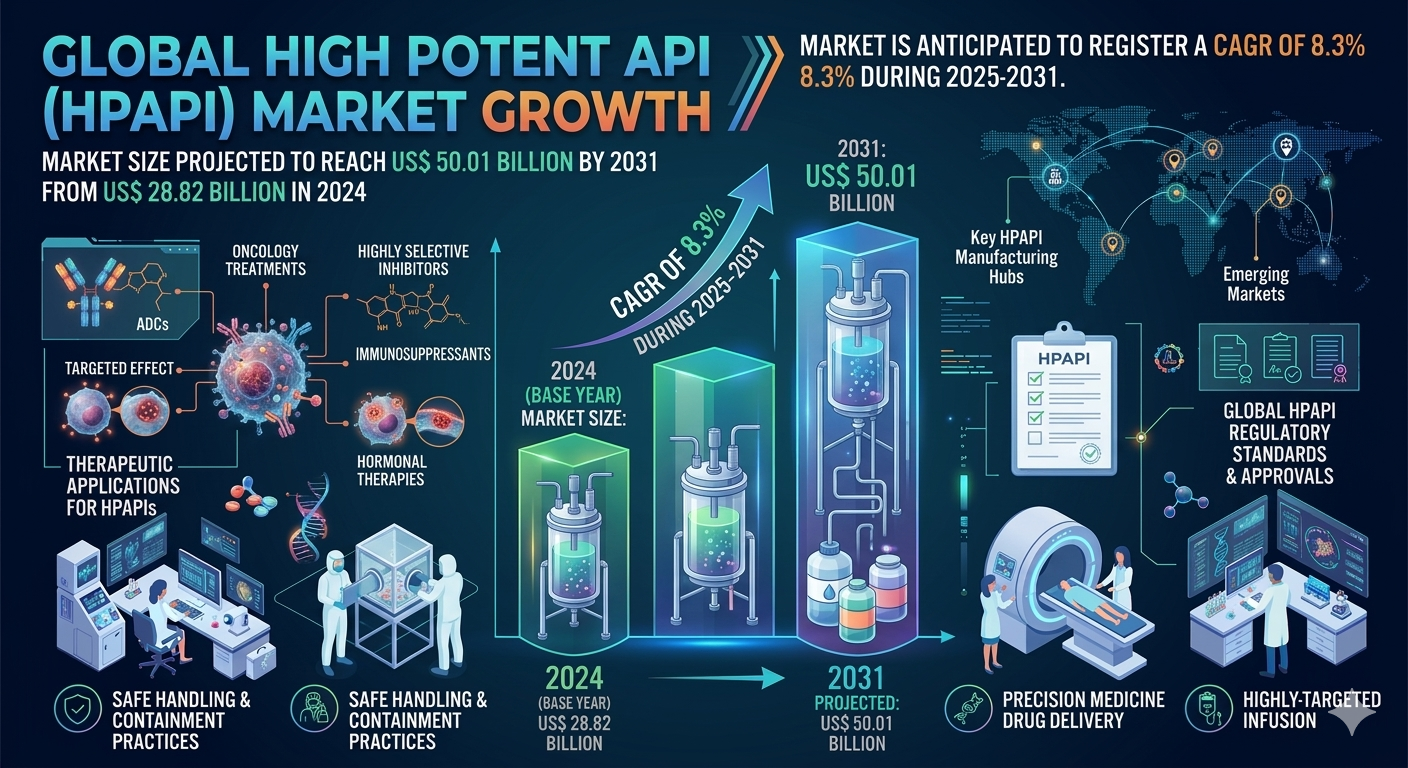 According to industry research, the global High Potent API market was valued at US$ 28.82 billion in 2024 and is projected to reach US$ 50.01 billion by 2031, registering a CAGR of 8.3% during 2025–2031. The market growth is primarily driven by increasing adoption of targeted cancer therapies, rising investments in drug discovery, and technological advancements in manufacturing processes. Pharmaceutical companies are also expanding their R&D pipelines to develop innovative potent molecules, which is further boosting demand for specialized API production facilities and contract manufacturing services.