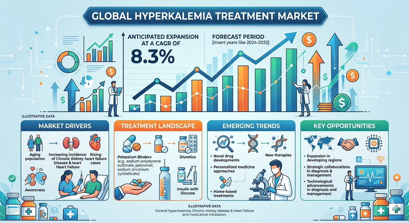 The global hyperkalemia treatment market Analysis is on a strong and sustained growth trajectory, driven by the escalating prevalence of chronic kidney disease (CKD), cardiovascular conditions, and the increasing adoption of next-generation potassium-binding medications. According to The Insight Partners, the hyperkalemia treatment market is anticipated to expand at a robust CAGR of 8.3% over the 2026–2034 forecast period, reflecting a growing and urgent global need for effective, accessible, and innovative potassium management solutions.