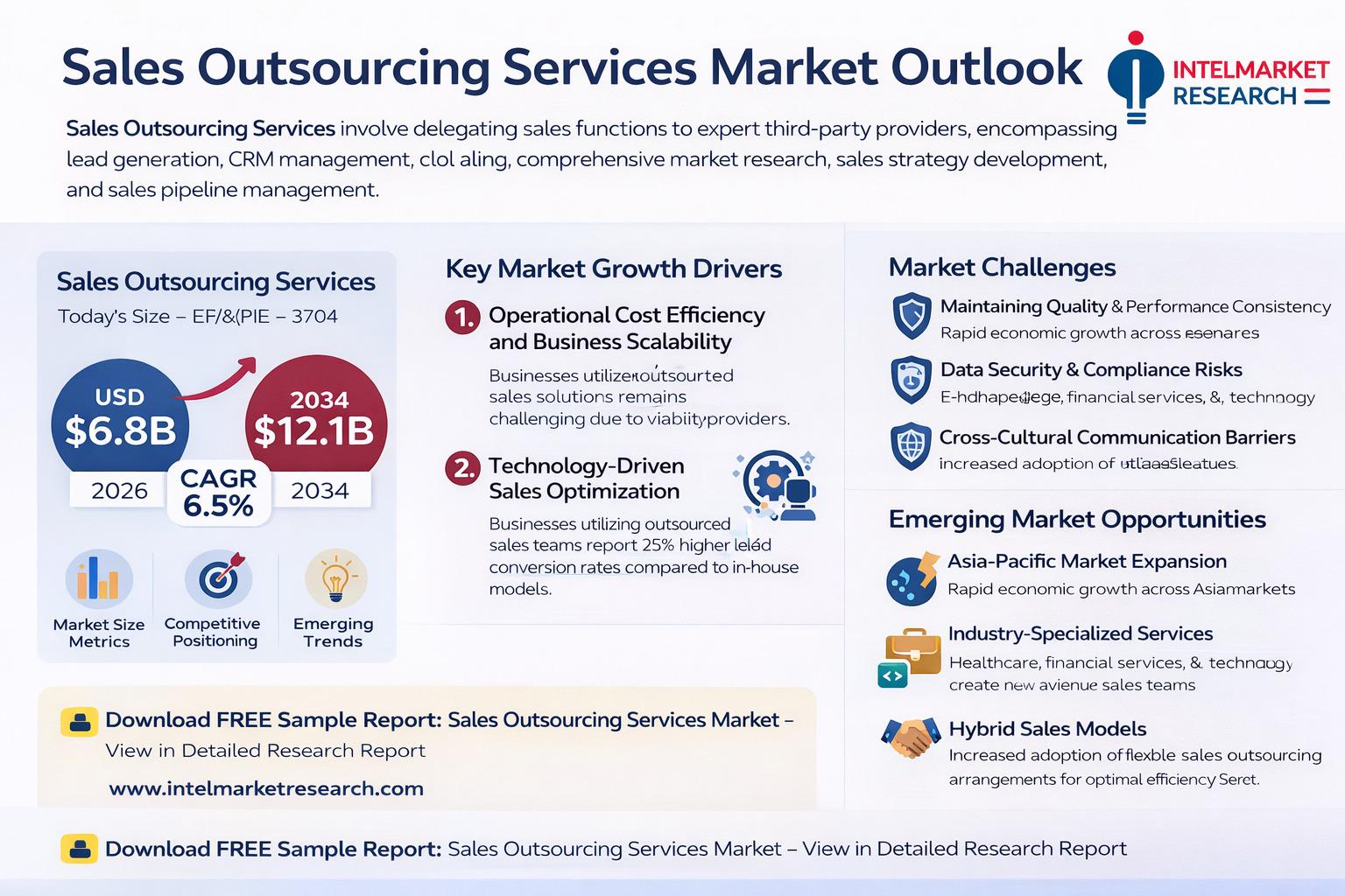 According to recent analysis from Intel Market Research, the global Sales Outsourcing Services market was valued at USD 6.8 billion in 2025 and is projected to reach USD 12.1 billion by 2034, growing at a steady CAGR of 6.5% during the forecast period (2026-2034). This expansion reflects increasing corporate demand for specialized sales expertise and cost optimization solutions across industries and geographies.