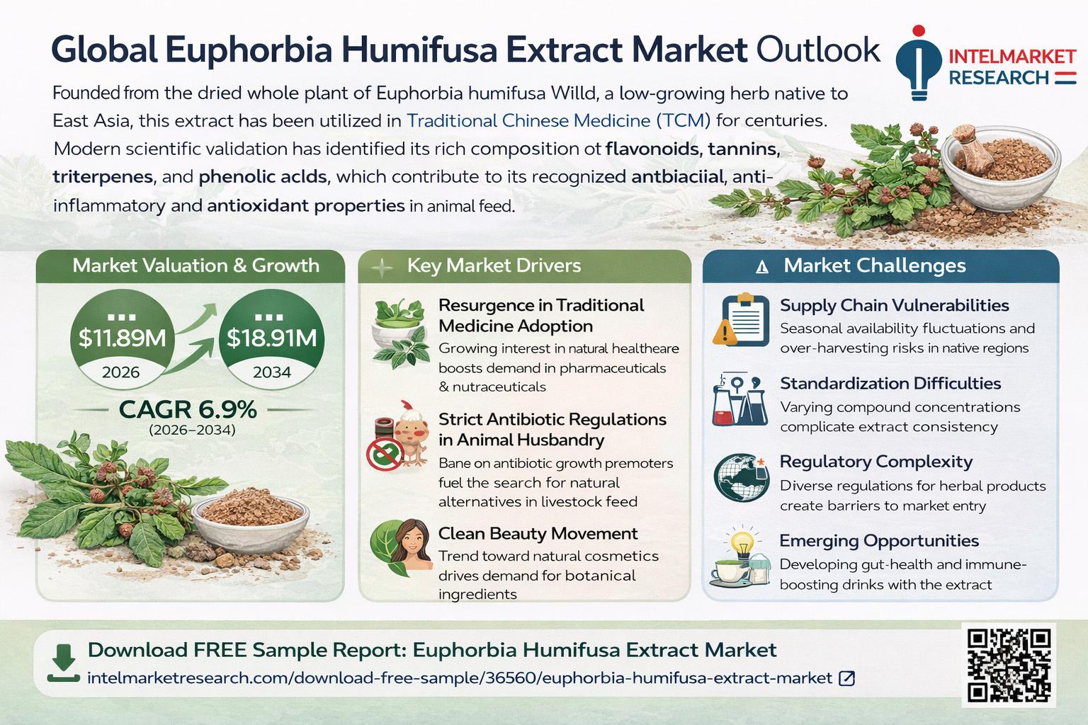According to a new comprehensive report from Intel Market Research, Global Euphorbia Humifusa Extract market was valued at USD 11.89 million in 2025 and is projected to reach USD 18.91 million by 2034, growing at a steady CAGR of 6.9% during the forecast period (2026–2034). This growth trajectory reflects increasing consumer demand for traditional herbal remedies and natural alternatives across pharmaceutical, nutraceutical, and cosmetic applications.