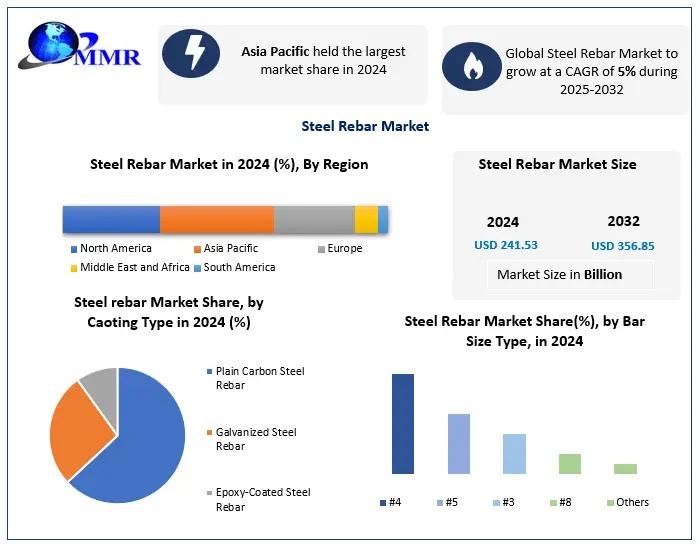 Anticipated Growth in Revenue: The Steel Rebar Market size was valued at US$ 241.53 Bn in 2024 and the total Steel Rebar Market revenue is expected to grow at a CAGR of 5% through 2025 to 2032, reaching nearly US$ 356.85 Bn.