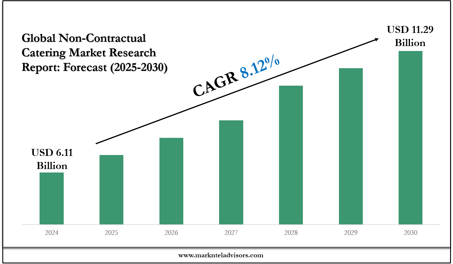 The Global Non-Contractual Catering Market size was valued at around USD 6.11 billion in 2024 and is projected to reach USD 11.29 billion by 2030. Along with this, the market is estimated to grow at a CAGR of 8.12% during the forecast period, i.e., 2025-2030.