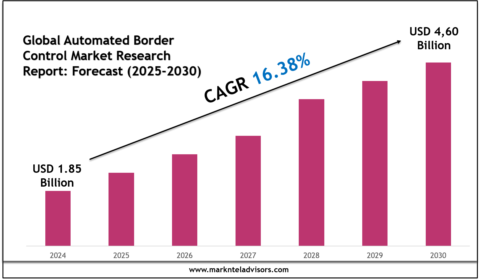 The Global Automated Border Control Market size was valued at around USD 1.85 billion in 2024 and is expected to reach USD 4.60 billion by 2030. Along with this, the market is estimated to grow at a CAGR of around 16.38% during the forecast period, i.e., 2025-30.