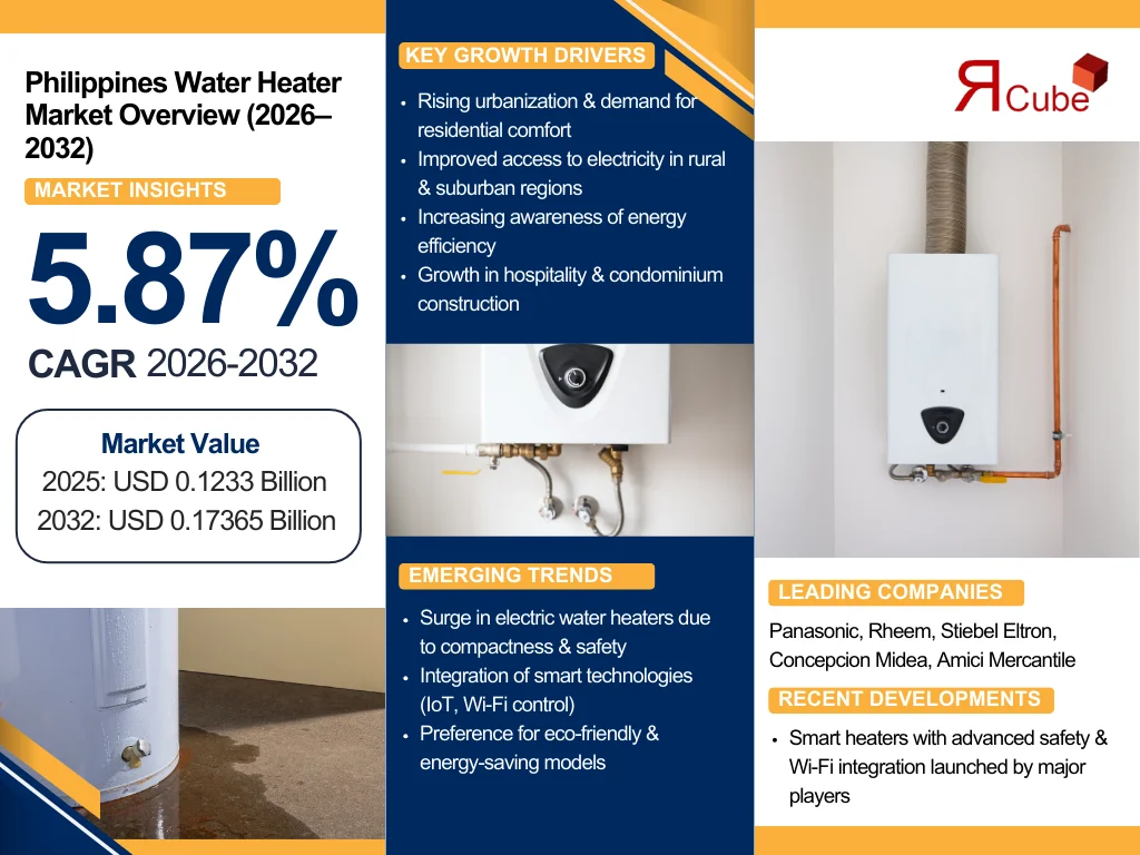 The Report Cube which is one of the leading market research company in UAE expects the Philippines Water Heater Market to grow at a CAGR of around 5.87% through 2032, as highlighted in their latest research report. The study provides an in-depth analysis of the emerging trends shaping the Philippines Water Heater Market and offers detailed forecasts for its potential growth during 2026–2032. The report also presents a comprehensive assessment of the competitive landscape, including profiles of leading players, their performance metrics, and recent strategic developments. Additionally, it explores the key market drivers, challenges, opportunities, and provides insights into historical and future revenue trends at the global, regional, and country levels.