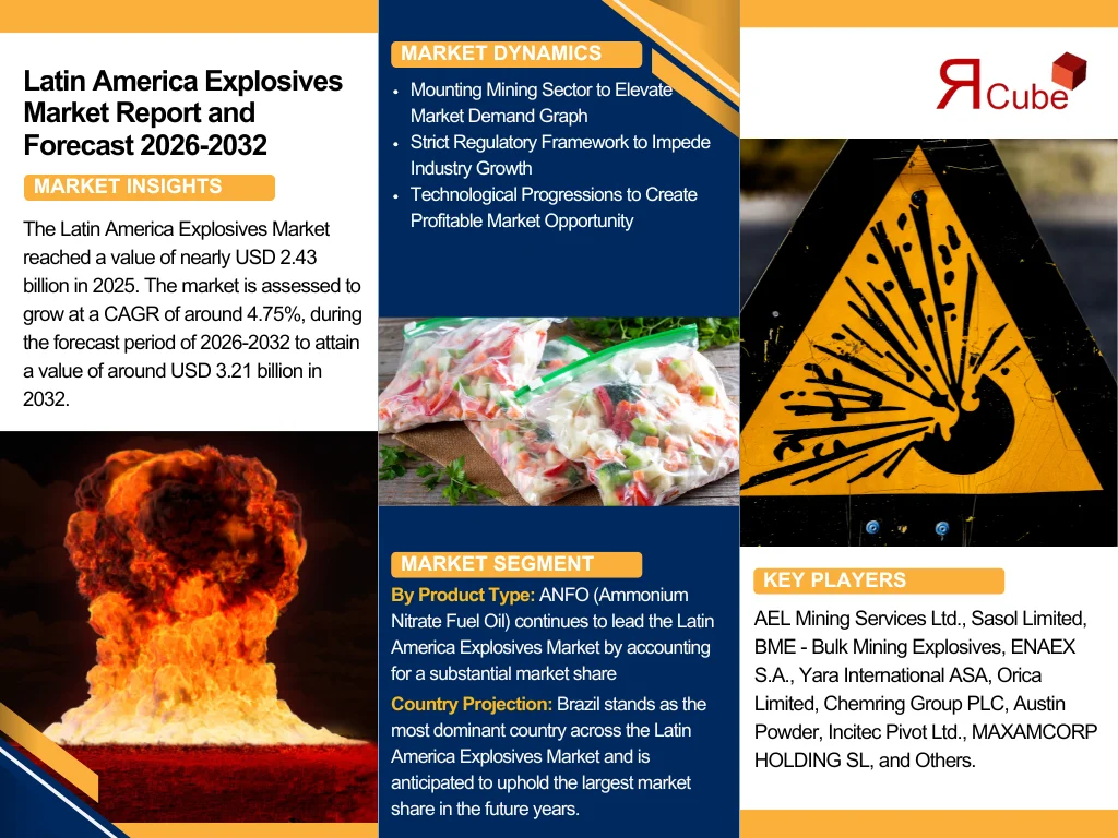 The Report Cube which is one of the leading market research company in UAE expects the Latin America Explosives Market to grow at a CAGR of around 4.75% through 2032, as highlighted in their latest research report. The study provides an in-depth analysis of the emerging trends shaping the Latin America Explosives Market and offers detailed forecasts for its potential growth during 2026–2032. The report also presents a comprehensive assessment of the competitive landscape, including profiles of leading players, their performance metrics, and recent strategic developments. Additionally, it explores the key market drivers, challenges, opportunities, and provides insights into historical and future revenue trends at the global, regional, and country levels.