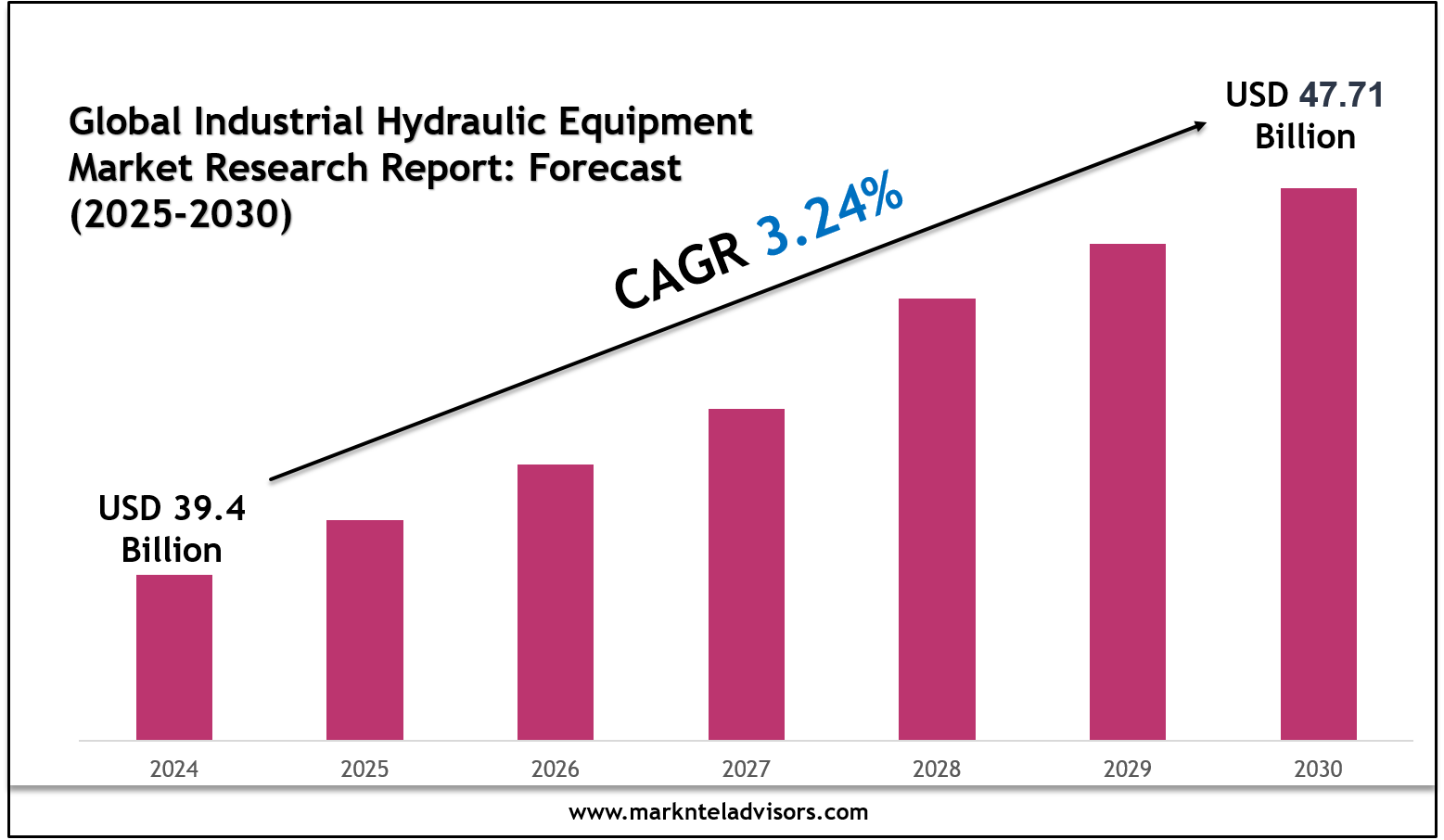 The Global Industrial Hydraulic Equipment Market size was valued at around USD 39.4 billion in 2024 and is projected to reach USD 47.71 billion by 2030. Along with this, the market is projected to grow at a CAGR rate of around 3.24% during the forecast period, 2025-30.