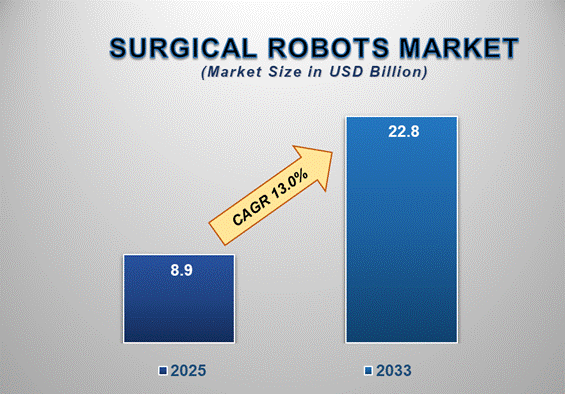 The Surgical Robots Market is projected to witness significant growth between 2025 and 2033, driven by the increasing number of surgical procedures hip and knee replacement surgeries. Valued at approximately USD 8.9 billion in 2025, the market is expected to soar to USD 22.8 billion by 2033, reflecting a strong compound annual growth rate (CAGR) of 13.0% over the next ten years.