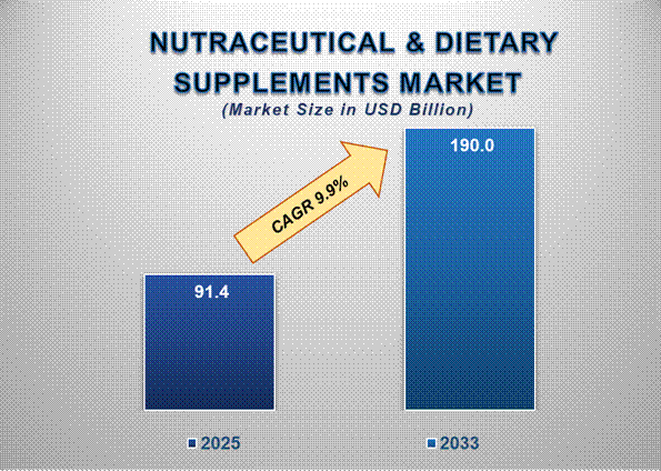 The global Nutraceutical & Dietary Supplements market is undergoing rapid expansion due to increasing consumer health consciousness, rising incidence of lifestyle-related diseases, and greater emphasis on preventive healthcare. The market was valued at USD 91.4 billion in 2025 and is projected to reach USD 190.0 billion by 2033, growing at a CAGR of 9.9% during the forecast period.