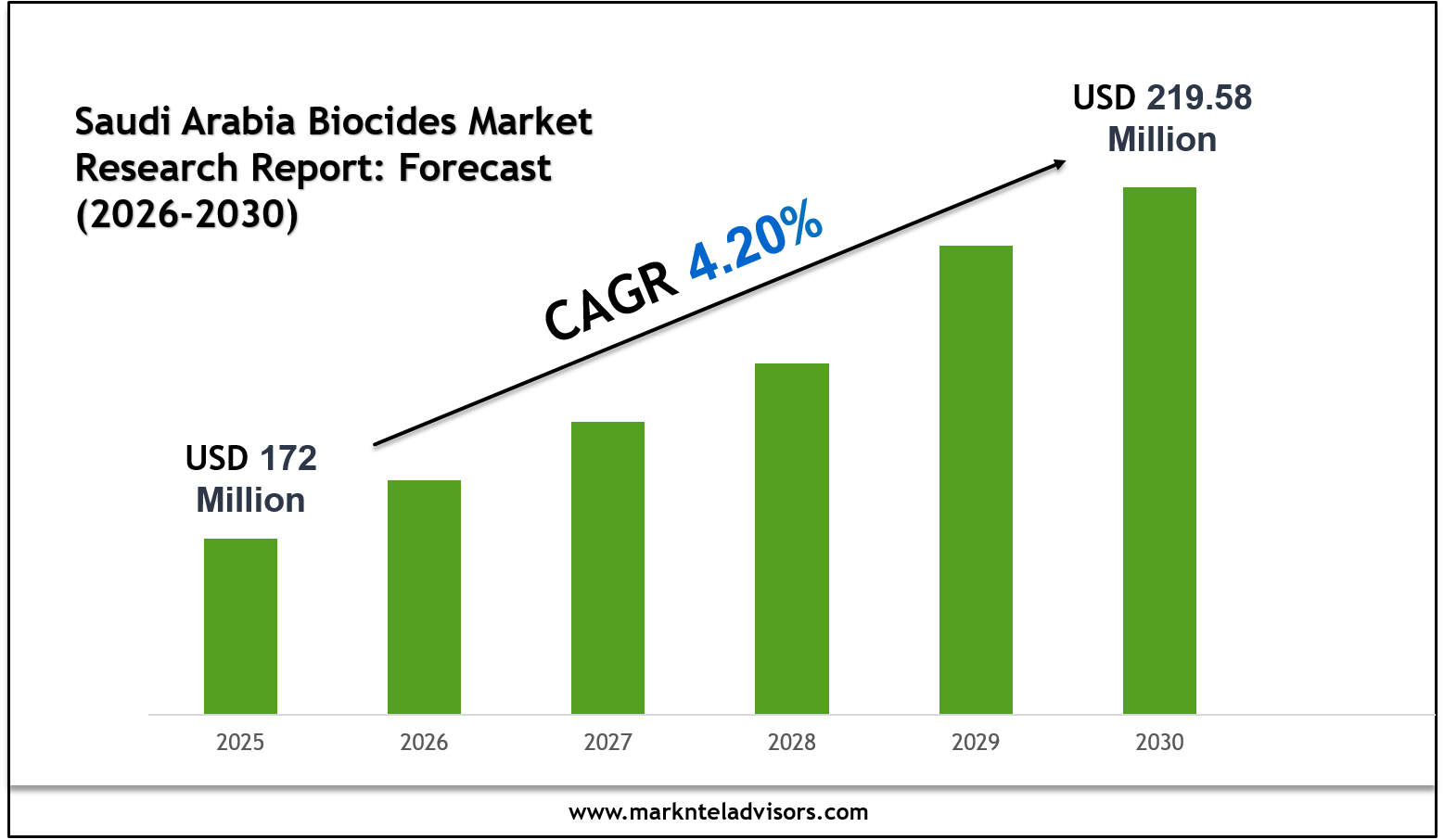 The Saudi Arabia Biocides Market size is valued at around USD 172 million in 2025 and is projected to reach USD 219.58 million by 2030. Along with this, the market is estimated to grow at a CAGR of around 4.20% during the forecast period, i.e., 2026-30.