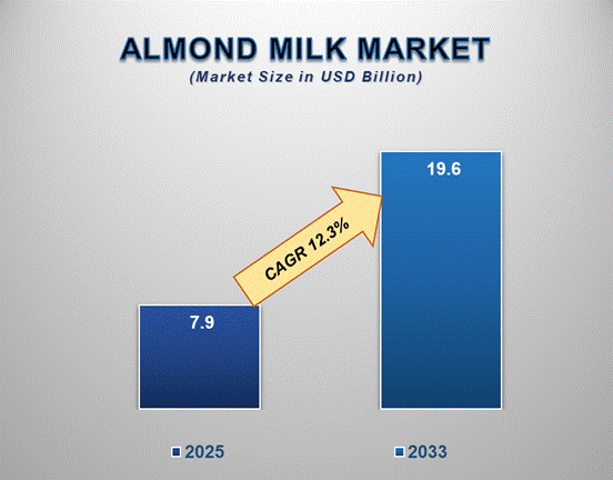The global almond milk market is witnessing strong growth, fueled by rising consumer adoption of plant-based dairy alternatives, increasing cases of lactose intolerance, and the growing demand for healthier beverages. Valued at USD 7.9 billion in 2025, the market is projected to reach USD 19.6 billion by 2033, growing at a CAGR of 12.3%.