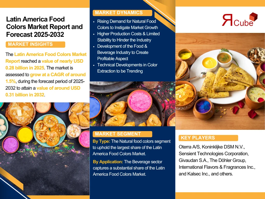 The Report Cube which is one of the leading market research company in UAE expects the Latin America Food Colors Market to grow at a CAGR of around 1.5% through 2032, as highlighted in their latest research report. The study provides an in-depth analysis of the emerging trends shaping the Latin America Food Colors Market and offers detailed forecasts for its potential growth during 2025–2032. The report also presents a comprehensive assessment of the competitive landscape, including profiles of leading players, their performance metrics, and recent strategic developments. Additionally, it explores the key market drivers, challenges, opportunities, and provides insights into historical and future revenue trends at the global, regional, and country levels.