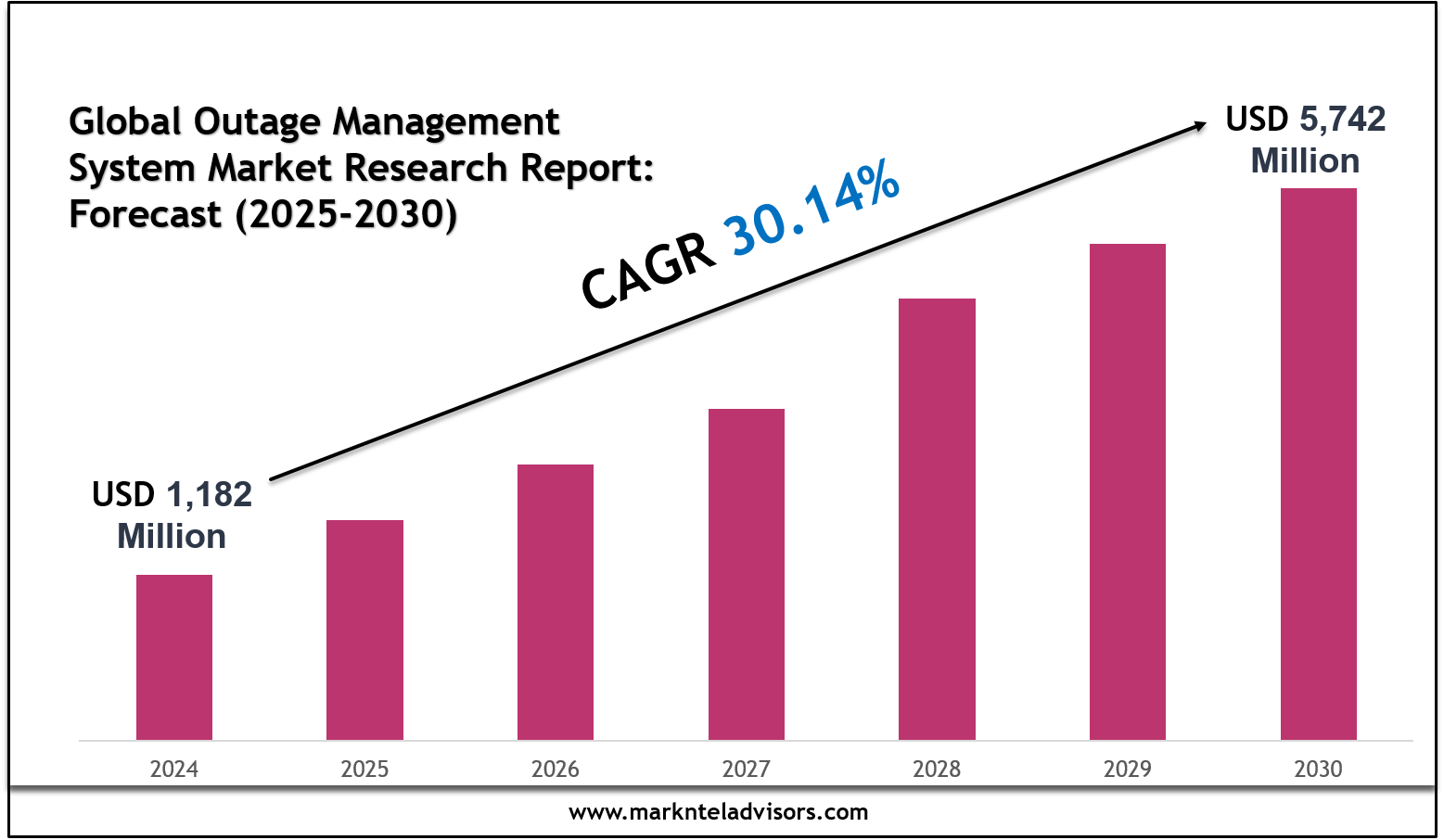 The Global Outage Management System Market size was valued at around USD 1,182 million in 2024 and is expected to reach USD 5,742 million by 2030. Along with this, the market is estimated to grow at a CAGR of around 30.14% during the forecast period, i.e., 2025-30.