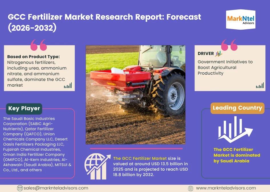 As per MarkNtel Advisors The GCC Fertilizer Market size is valued at around USD 13.5 billion in 2025 and is projected to reach USD 18.8 billion by 2032. Along with this, the market is estimated to grow at a CAGR of around 4.84% during the forecast period, i.e., 2026-32.
