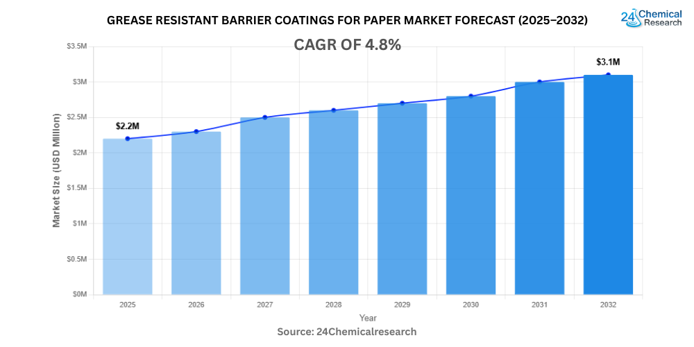 Global Grease Resistant Barrier Coatings for Paper Market continues to demonstrate stable growth, with its valuation reaching USD 2.24 billion in 2024. According to the latest industry analysis, the market is projected to grow at a CAGR of 4.8%, reaching approximately USD 2.96 billion by 2032. This growth is fueled by expanding food packaging applications and rapid adoption of sustainable alternatives to plastic-based solutions.