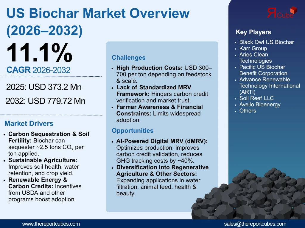 According to the latest report by The Report Cube, study US Biochar Market is anticipated to register a CAGR of around 11.1% during the forecast period, 2026-32. Additionally, the market size was valued at nearly USD 373.2 million in 2025 and is projected to reach nearly USD 779.72 million by 2032.