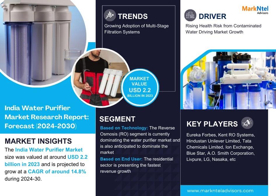 According to MarkNtel Advisors study The India Water Purifier Market size was valued at around USD 2.2 billion in 2023 and is projected to grow at a CAGR of around 14.8% during the forecast period, i.e., 2024-30. Rising health risks associated with contaminated water are driving the India Water Purifier Market. The risk of waterborne disease is increasing with increasing urbanization and population density causing frequent contamination of water sources. As a result, the demand for water purifiers is propelled since consumers seek reliable solutions to ensure safe and clean drinking water to stay healthy and hygienic. The awareness about the connection between water quality and health further boosts market size & volume as individuals and institutions are ready to invest in advanced purification technologies. Additionally, as the country moves towards urbanization and smart cities the demand for smart home application is increasing, this condition accelerates the market growth of the smart water purifiers industry in the country.