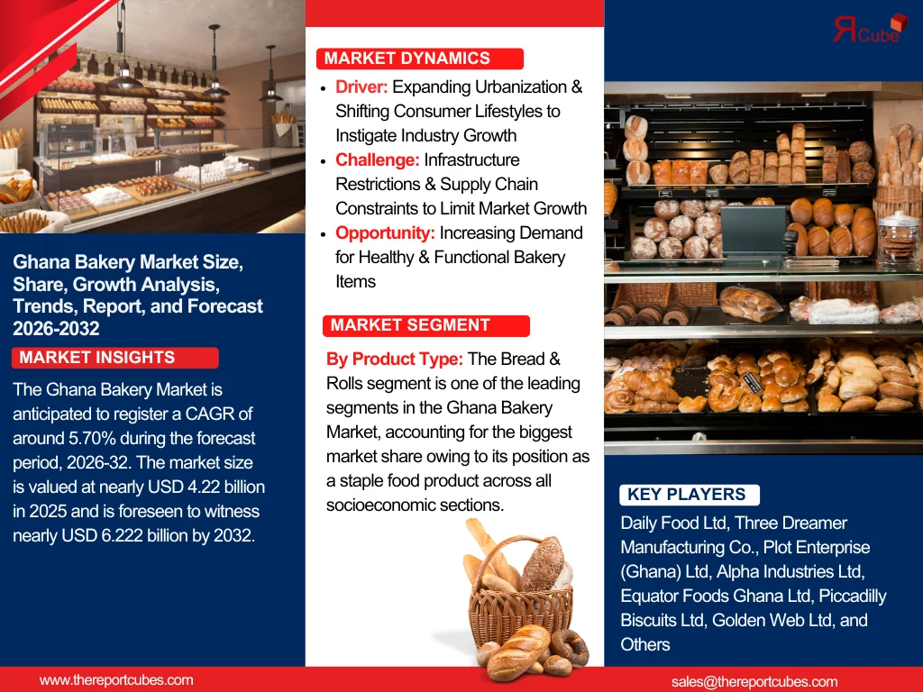 According to the latest report by The Report Cube, study Ghana Bakery Market is anticipated to register a CAGR of around 5.70% during the forecast period, 2026-32. The market size is valued at nearly USD 4.22 billion in 2025 and is foreseen to witness nearly USD 6.222 billion by 2032.