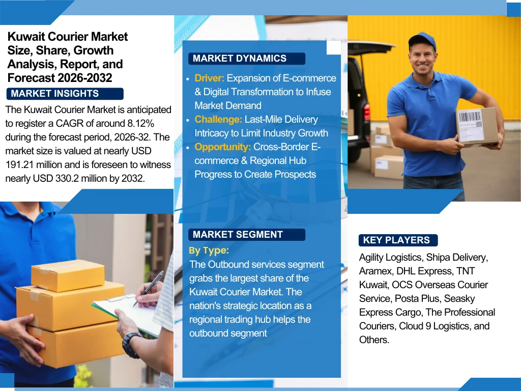 According to the latest report by The Report Cube, study Kuwait Courier Market is anticipated to register a CAGR of around 8.12% during the forecast period, 2026-32. The market size is valued at nearly USD 191.21 million and is foreseen to witness nearly USD 330.2 million by 2032.